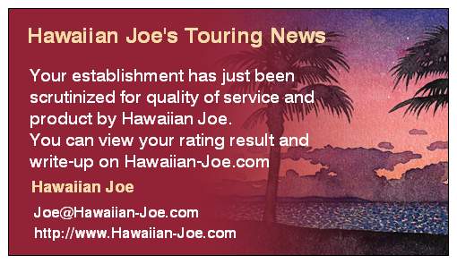I place the card, along with my bank card, when paying the tab. The best part is the look on their faces when they come back to the table for my autograph. They know what kind of service or product they delivered. Based on their own actions or service, they can pretty much figure where their rating is at, along with what will be said in their upcoming write-up. These are my opinions and my opinions alone. I will say, I do everything humanly possible to be as fair as I can without showing favoritisms. And everything in print is as factual as I can make it and still make it interesting for you to read for informational purposes. My whole objective is to expose the bad and the ugly, identify the good, and provide you honest, straightforward information regarding the places to visit which I think are a good value and that you will enjoy. In my opinion, there are so many things to do and see in every location, there is no way anyone can begin to see it all in a two week vacation. Many travelers have never vacationed at a specific location before and they are seeing it on their first trip, and I want to ensure they have the information they need to make the most of it while they're visiting. Another service we offer is keeping you informed of cheap airfares, hotel specials, and car rentals, et cetera as we receive the information from our major business associates. Within the last few years alone, there have been numerous airfare price wars with air travel. The rates, on many occasions, have been as low as $19 one-way. The problem is that when the price wars are announced, they are only good for approximately 1 to 2 days and must be used within a specified time frame - usually a 3 month window. What we do is notify our subscribers immediately that a major drop in airfare has occurred. So, you get the notification, sign-on to the vendor, and purchase your ticket. Again, if you're interested in receiving our travel updates for your specific location or destination then you can register by visiting Joe's News Center. Many times throughout the